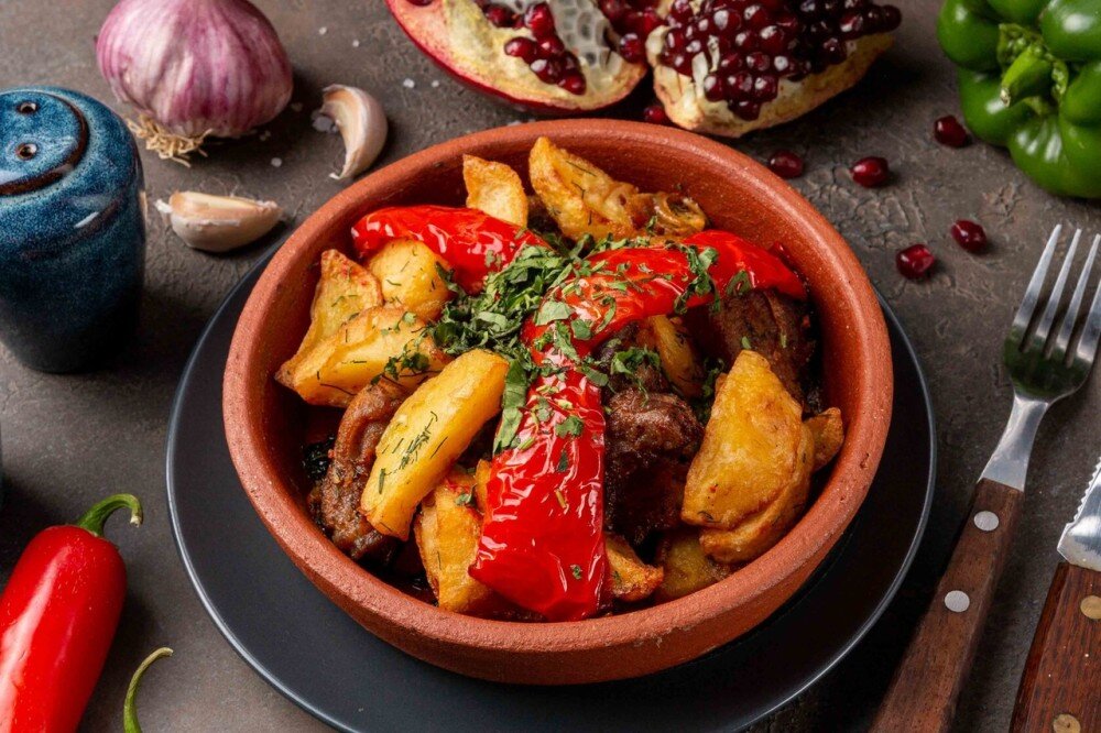 свиная шейка с обжаренным до золотистого цвета картофелем, свежей зеленью, чесноком, луком и болгарским перцем