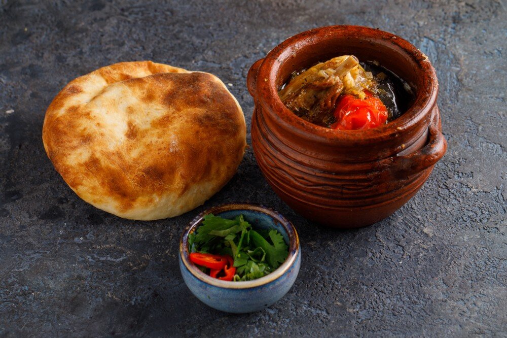 баранина, запечённые баклажаны и болгарский перец, молодой картофель, свежие томаты, стручковый зелёный перец, кинза и красный базилик