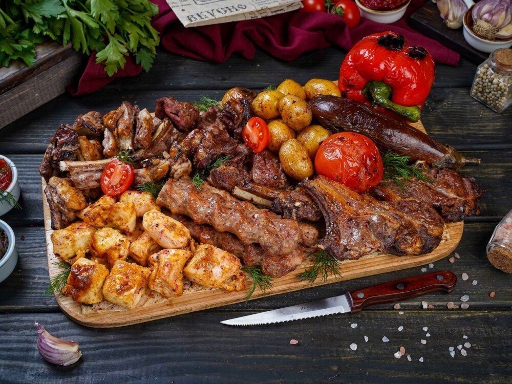 Свиные ребра (1 порция), свиная мякоть (1 порция), куриный шашлык (1 порция), люля-кебаб куриный (1 порция), люля-кебаб из говядины (1 порция), картофель черри на мангале (1 порция), овощное ассорти (1 баклажан, помидор, перец), лук красный, зелень, лаваш армянский, соус шашлычный (6 шт.)